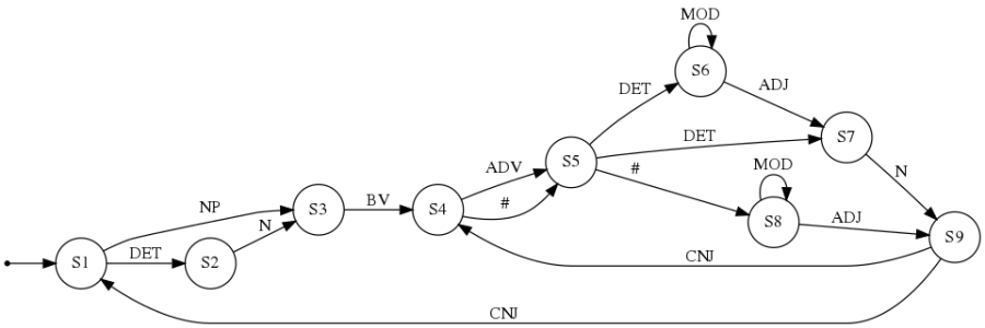 The Finite State Machines here are based on those given in the book “Natural Language Processing in Pop-11” by Gerard Gazdar, Chris Mellish. But are writen in Python and not Pop-11. There are another two versions of this book for PROLOG and LISP. While the languages covered are not so common these days, these three books are still an excellent place to start because they provide insight into the programming techniques used during the early days of Natural Language Processing.