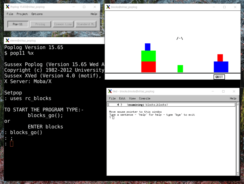 POPLOG is an integrated toolkit providing a highly extendable collection of languages and tools suitable for absolute beginners, advanced researchers and system programmers. The toolkit was developed at Sussex University during the 80s. While POPLOG is no longer actively developed, the environment is still useful for prototyping applications. POPLOG’s core language is POP-11, which was developed by Robin Popplestone, a pioneer in the fields of machine intelligence and robotics. Thus, when the British government created the Alvey Programme as a reaction to the Japanese Fifth generation computer project, POPLOG became a core component of many projects.